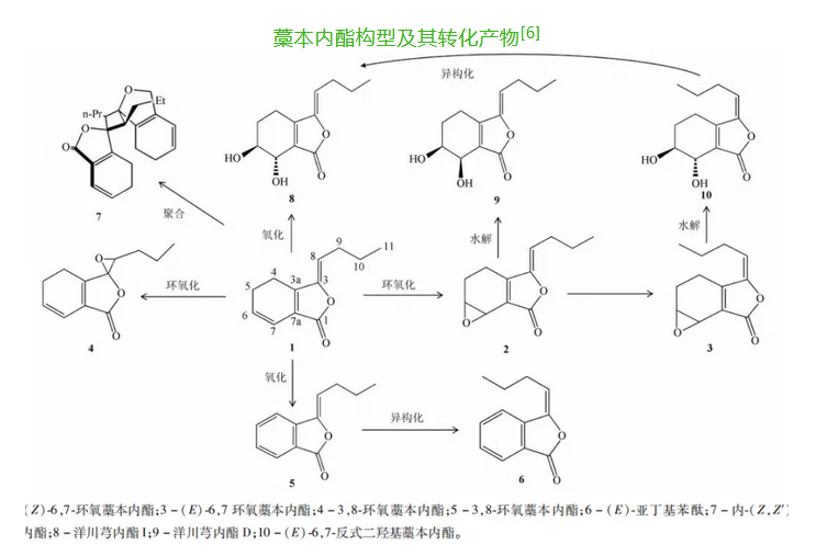 藁本內酯結構中有環(huán)外雙鍵可分為順反兩種異構體即(Z)-Ligustilide和(E)-Ligustilide。由于Z型結構為空間優(yōu)勢構象比E型更穩(wěn)定,因而Z型藁本內酯在中藥材中含量為E型的10倍以上[1]。藁本內酯是不飽和苯酞結構且3位上有活潑的丁烯基,因而穩(wěn)定性不佳極易發(fā)生異構化、氧化、環(huán)加成、聚合等結構變化產(chǎn)生其他結構相近的苯酞類化合物。