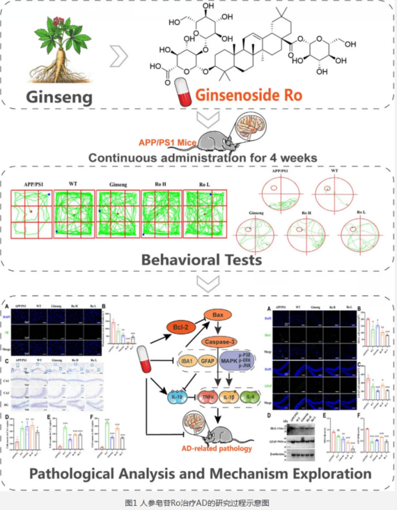 人參皂苷Ro通過(guò)減少Aβ沉積、改善神經(jīng)元凋亡和神經(jīng)炎癥,以及調(diào)控MAPK通路來(lái)實(shí)現(xiàn)改善空間探索能力、記憶認(rèn)知功能。具有開發(fā)成為AD治療藥物的潛力。[5][6]