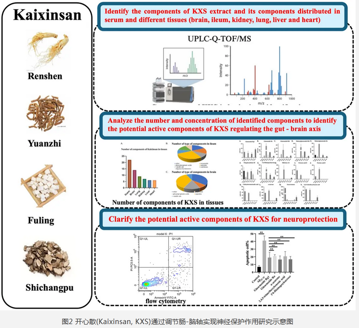 人參皂苷Ro作為開心散(Kaixinsan, KXS)的重要活性成分,通過(guò)調(diào)節(jié)腸-腦軸實(shí)現(xiàn)神經(jīng)保護(hù)作用。為KXS在防治阿爾茨海默病、抑郁癥等神經(jīng)退行性疾病中的應(yīng)用提供了理論依據(jù)。[7]