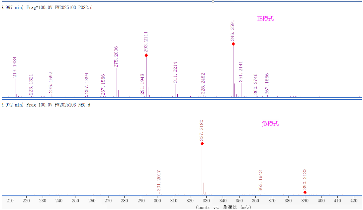 分子量預測過程中,最容易導致誤判的是圖中出現(xiàn)的看似“相關”的干擾離子,如[M+NH4]+與[M]+,[M-H2O+H]+與[M +H]+都是間隔18。如下圖中,275與293,328與346均間隔18,單正模式,無法確定分子量為292還是328。但結(jié)合負模式可確定為328。