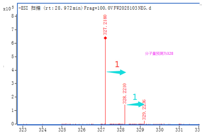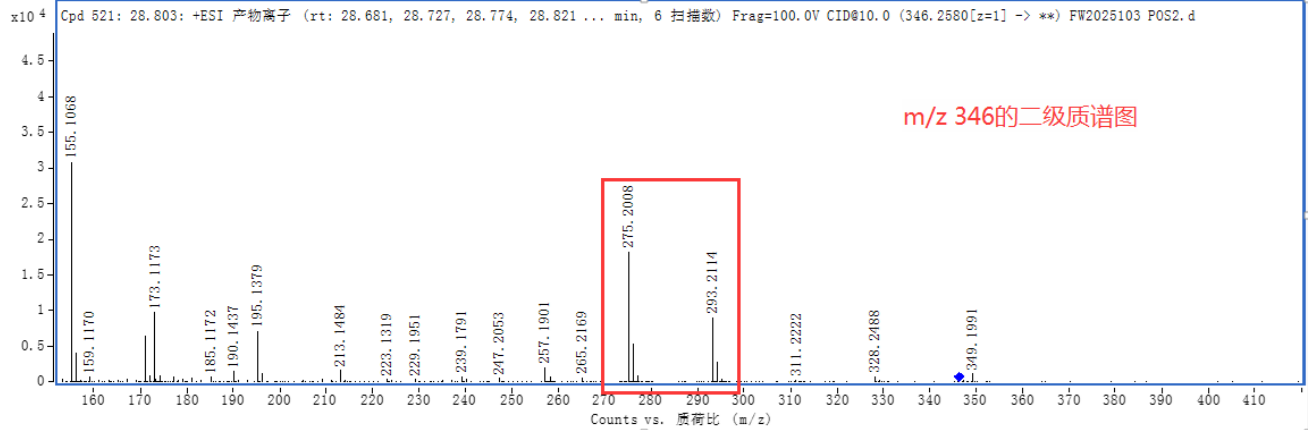 然分子量292的排除需結(jié)合二級質(zhì)譜圖,可發(fā)現(xiàn)275、293均為分子量328的[M+NH4]+的碎片離子。