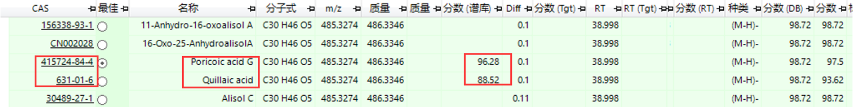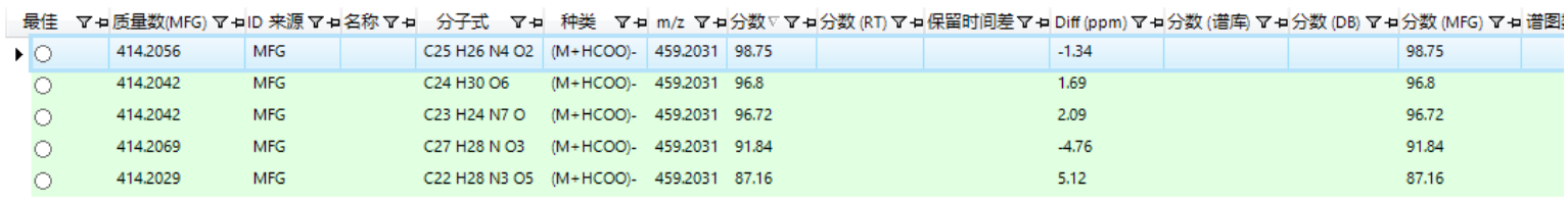 對于軟件擬合的分子式,可通過“N規(guī)則”、天然產(chǎn)物常見元素、擬合的質(zhì)量偏差、擬合分數(shù)等進行進一步縮小范圍,獲得最可能的分子式結(jié)果,以獲得更準確結(jié)果。