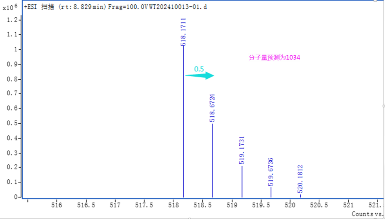 特別要注意的是,同位素間隔除了與元素種類相關,也與電荷態(tài)相關,也是容易出現(xiàn)預測失誤的關鍵點。通常情況下,同位素間隔=1/電荷態(tài)。如同位素間隔為0.5,則為雙電荷,分子量往往為分子離子的2倍。
