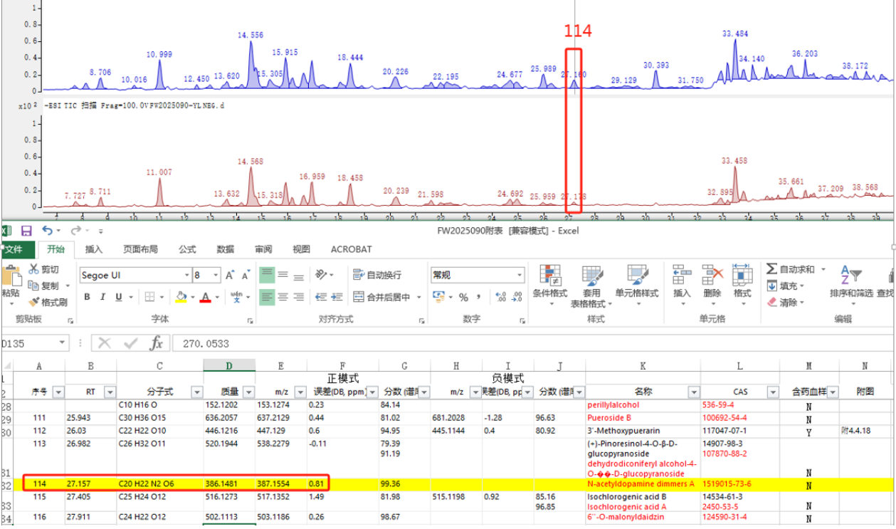 當然,要保證結(jié)果的準確性,單依賴數(shù)據(jù)庫是遠遠不夠的。人工審核有助于排除假陽性和假陰性結(jié)果。如下圖114號峰,數(shù)據(jù)庫判定為分子量386的化合物,但通過回歸質(zhì)譜峰發(fā)現(xiàn),該峰有兩個明顯分子離子峰387和563。那么563就是一個假陰性結(jié)果,387如果是563的碎片就是一個假陽性結(jié)果,需要進一步通過二級碎片去驗證。