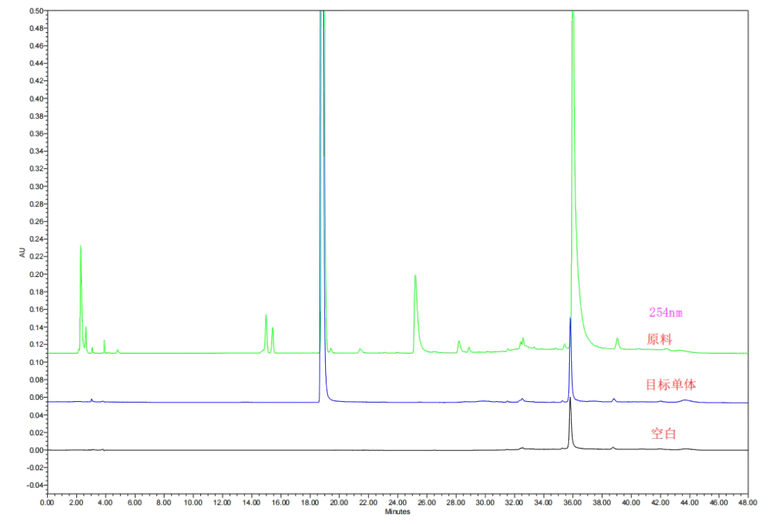 制備液相優(yōu)化:選用內(nèi)徑150mm系統(tǒng),梯度洗脫結(jié)合動(dòng)態(tài)軸向壓縮柱技術(shù),單批次處理量達(dá)50g原料,獲得目標(biāo)成分120g,純度99.2%(HPLC圖譜見下圖)原料及單體分離圖譜: