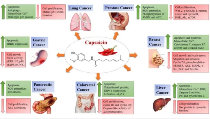 4.抗癌作用:多項(xiàng)研究表明,辣椒素可以調(diào)節(jié)參與癌細(xì)胞增殖、細(xì)胞周期阻滯、信號轉(zhuǎn)導(dǎo)、凋亡和轉(zhuǎn)移的基因和酶的表達(dá)水平,具有顯著的抗腫瘤活性,對胃癌、乳腺癌、肺癌、前列腺癌、結(jié)直腸癌、胰腺癌等多種類型的人類癌癥均有較強(qiáng)的抗癌作用(圖一)。