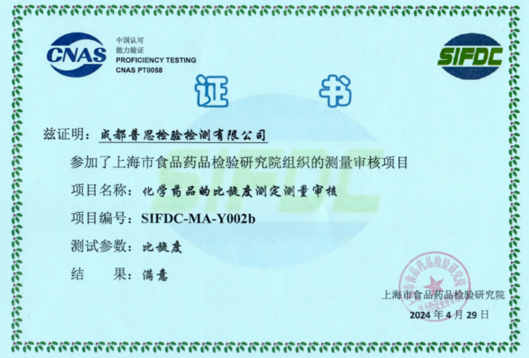 近日,成都普思生物科技股份有限公司旗下子公司“成都普思檢驗(yàn)檢測有限公司”通過了由上海市食品藥品檢驗(yàn)研究院于2024年組織的測量審核項(xiàng)目“化學(xué)藥品的比旋度測定”,結(jié)果為“滿意”。