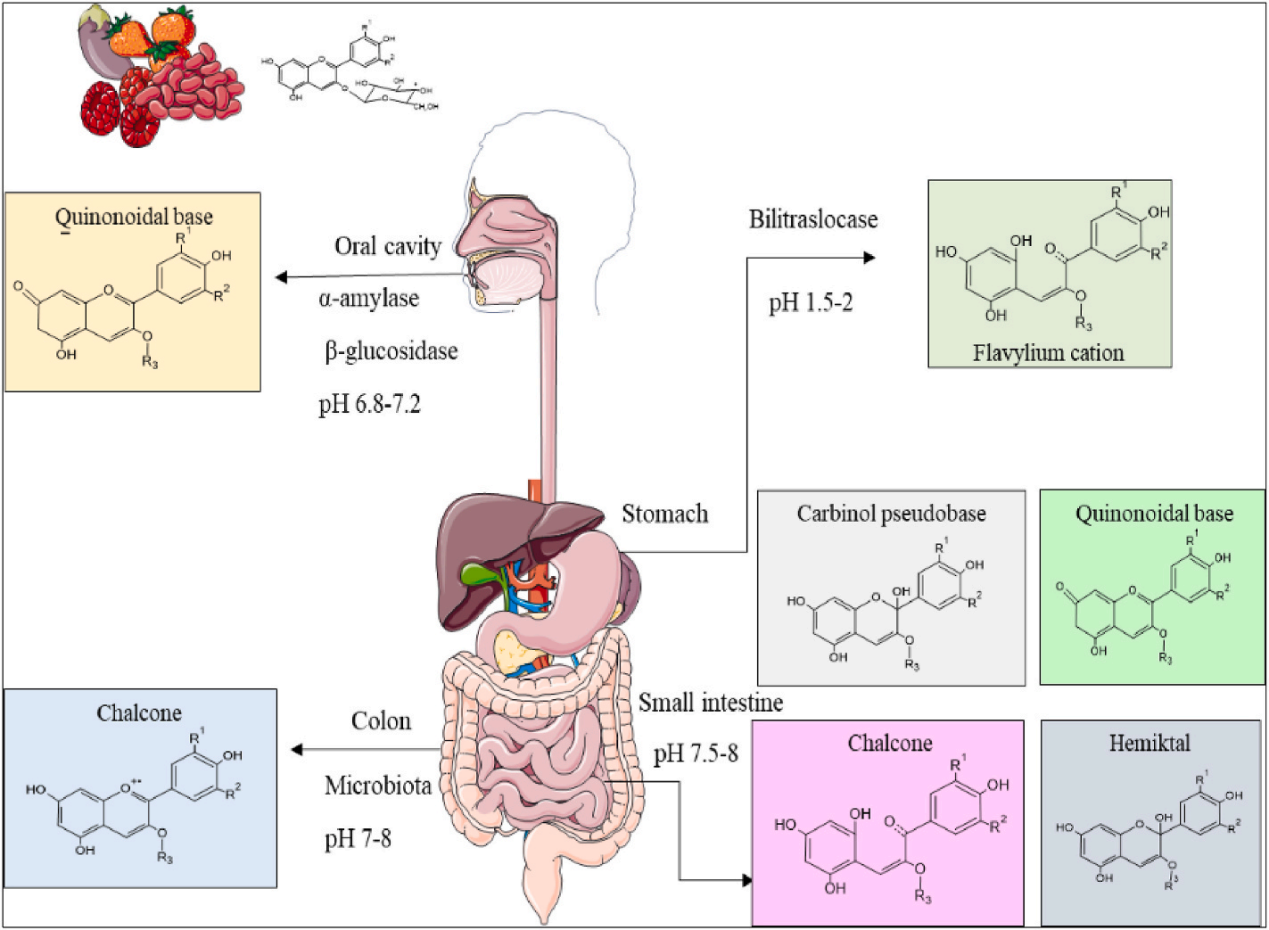 圖5 矢車菊素-3-O-葡萄糖苷(C3G)在人體胃腸道不同部位的降解和吸收示意圖[9]