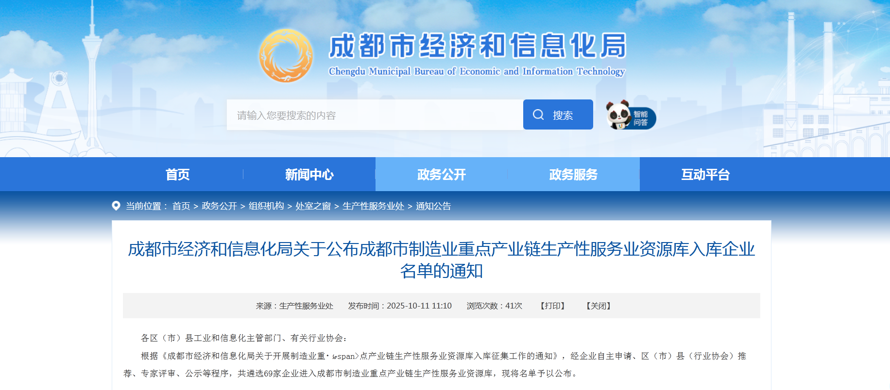 今日,成都市經(jīng)濟和信息化局公布“成都市制造業(yè)重點產(chǎn)業(yè)鏈生產(chǎn)性服務(wù)業(yè)資源庫擬入庫名單”。